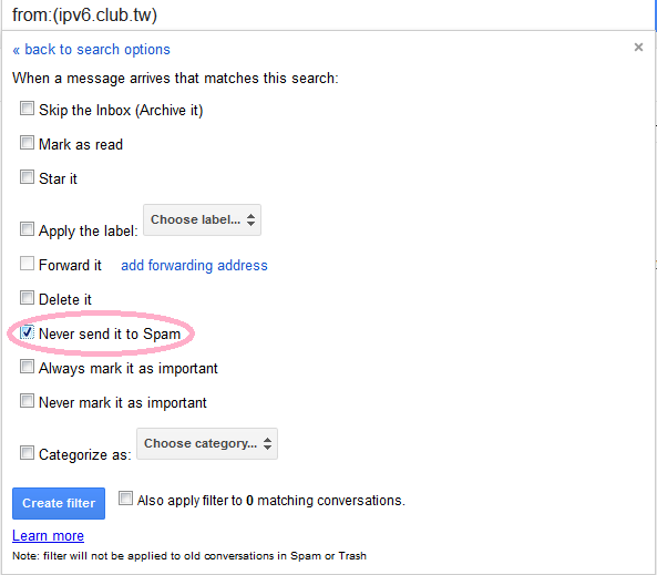 - In the "From" field, type "ipv6.club.tw", and click "Create filter